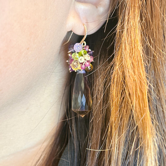 Ametrine pink tourmaline ruby citrine Amethyst cluster earrings, a beautiful gold statement piece to any jewelry collection