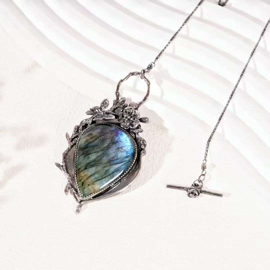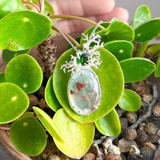 Aqua chalcedony Russian chrome diopside pendent necklace, unique casting statement piece