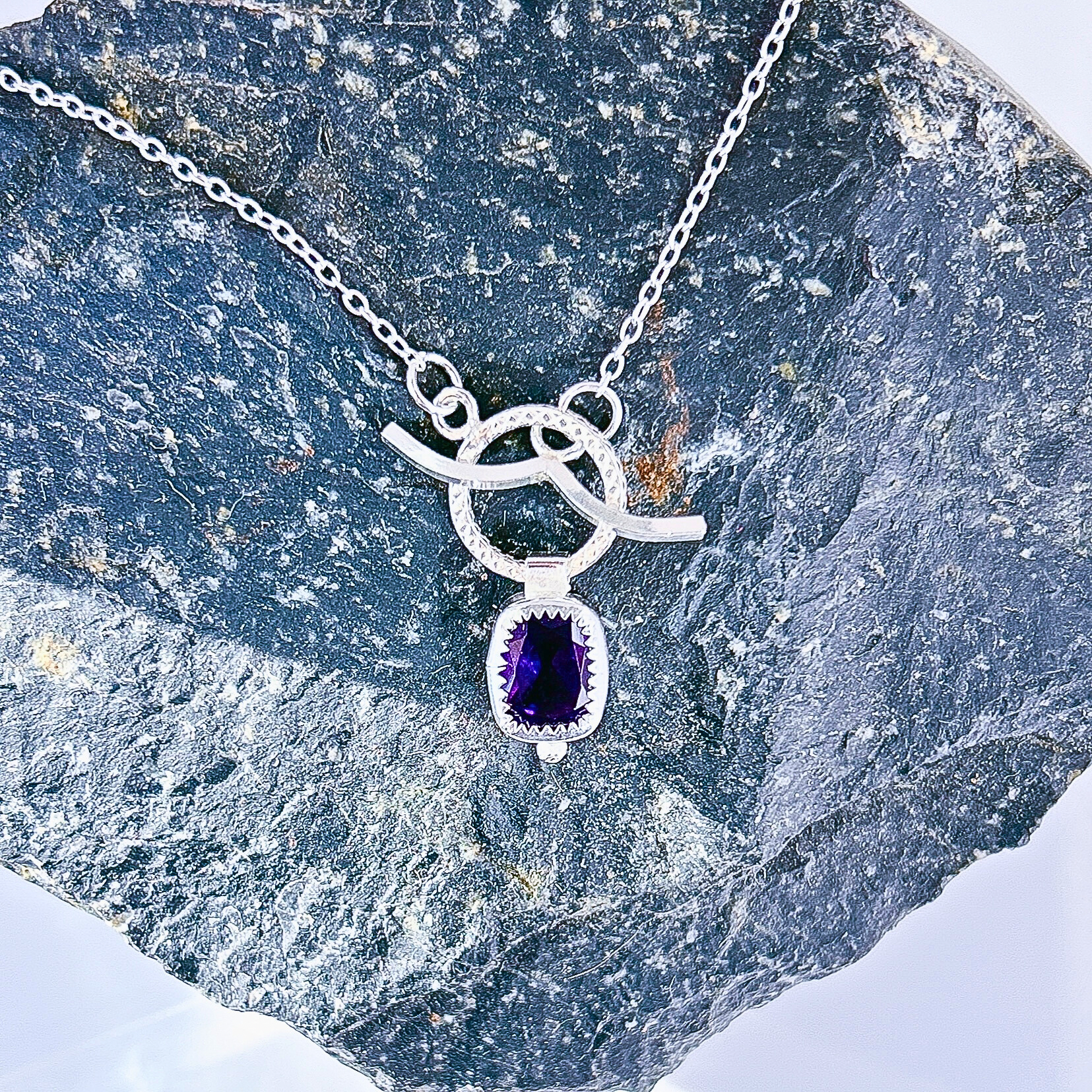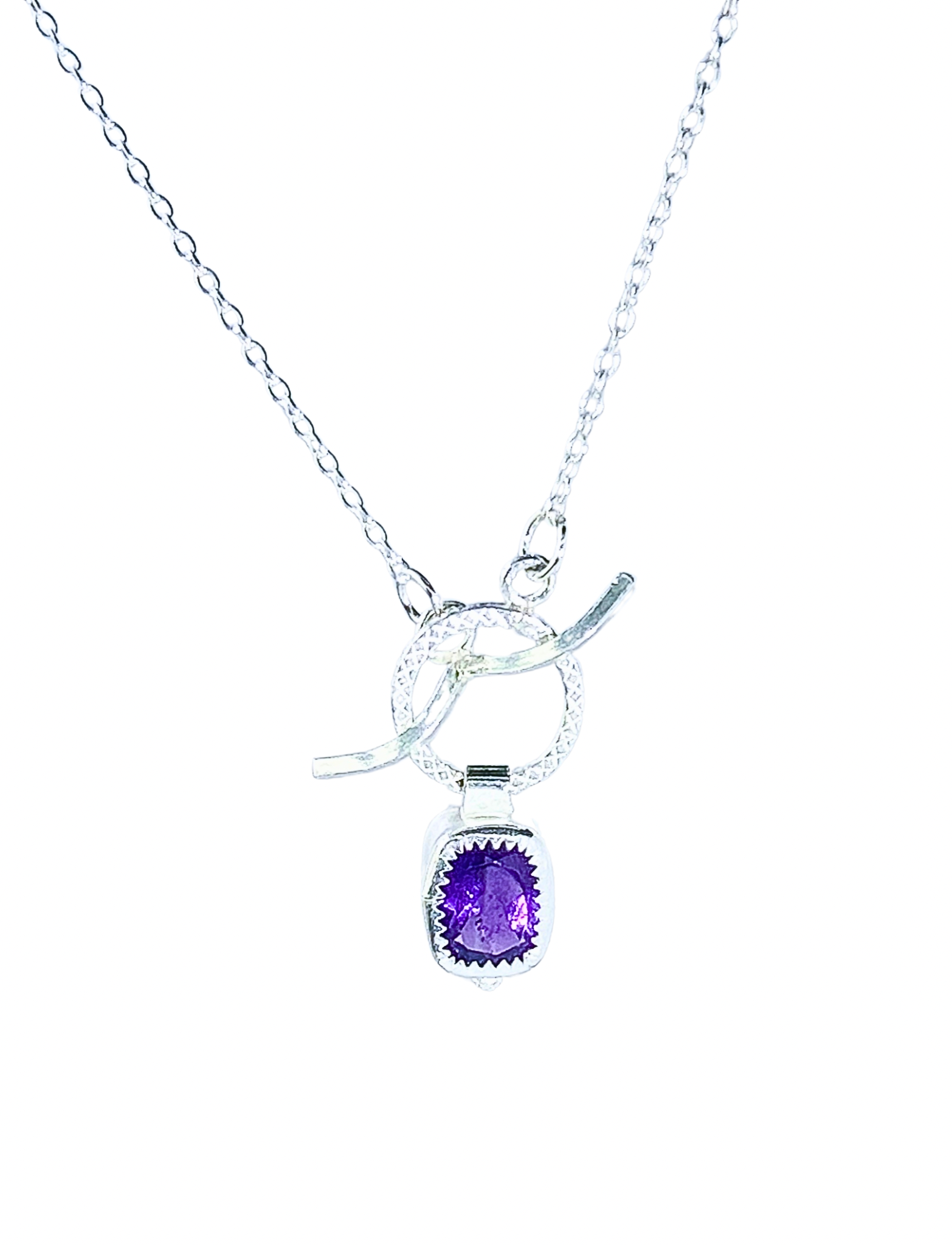Amethyst cushion single gemstone necklace, amethyst chocker sterling silver necklace, front toggle necklace with healing purple gemstone.