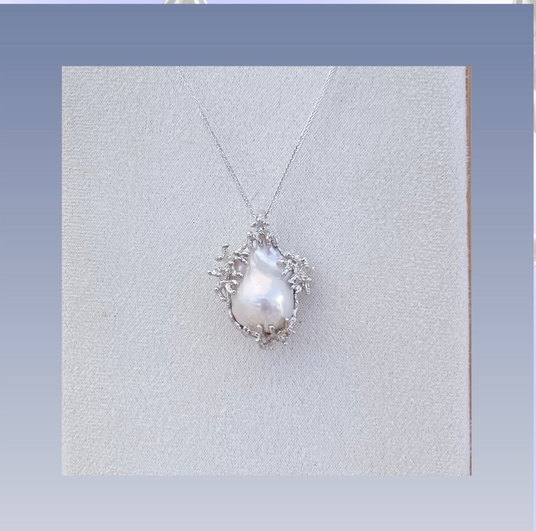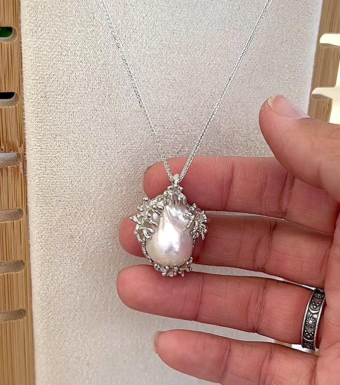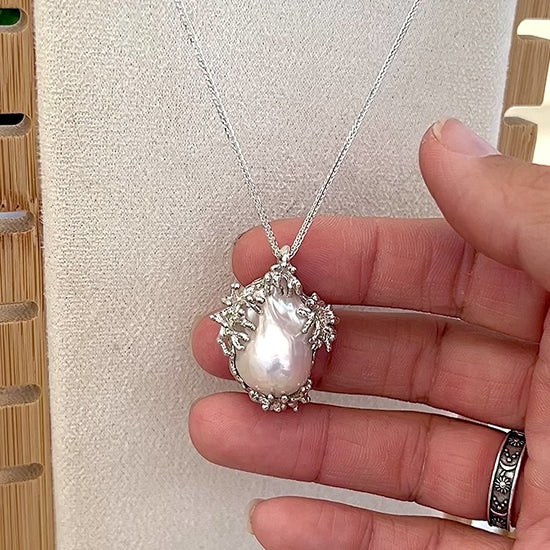 baroque pearl pendant, an exclusive flame ball cultured pearl necklace with artisan sterling silver branches.