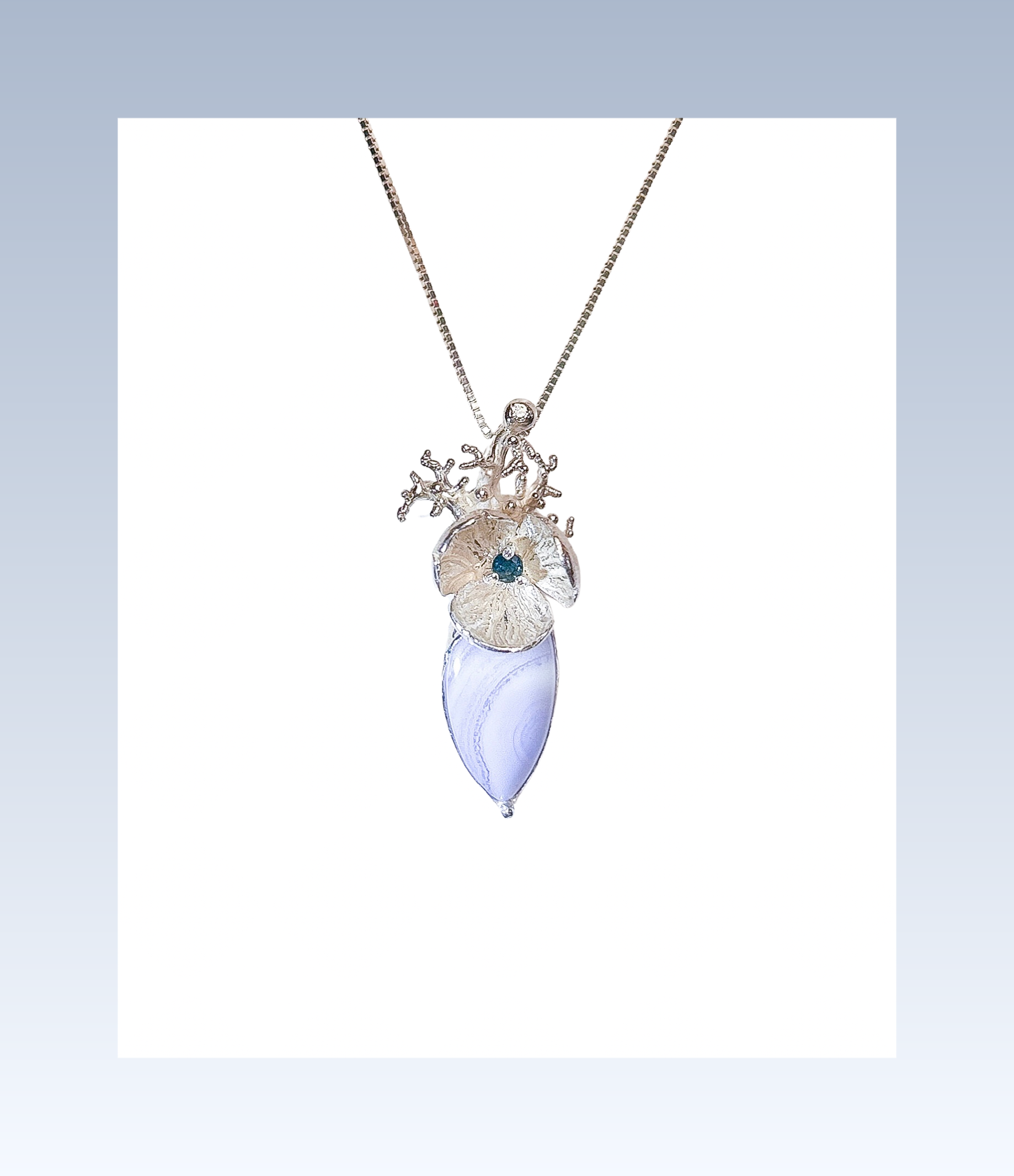 Gemstone: bezel setting blue lace agate pendent with sapphire, moissanite.