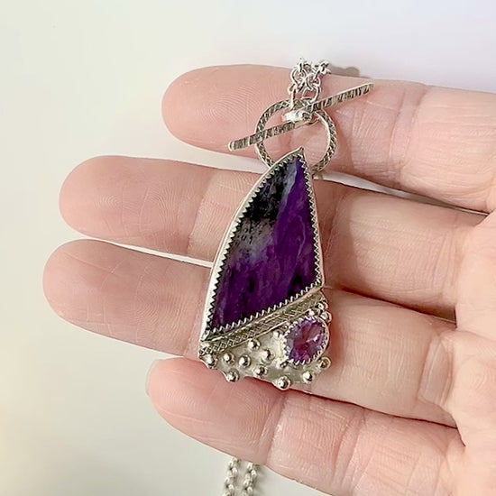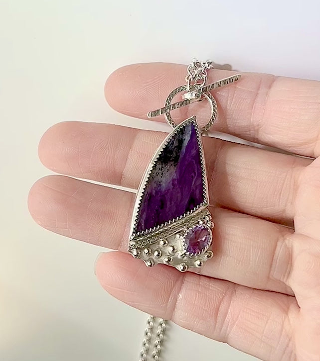 Gemstone: bezel setting large purple charoite pendent with amethyst.