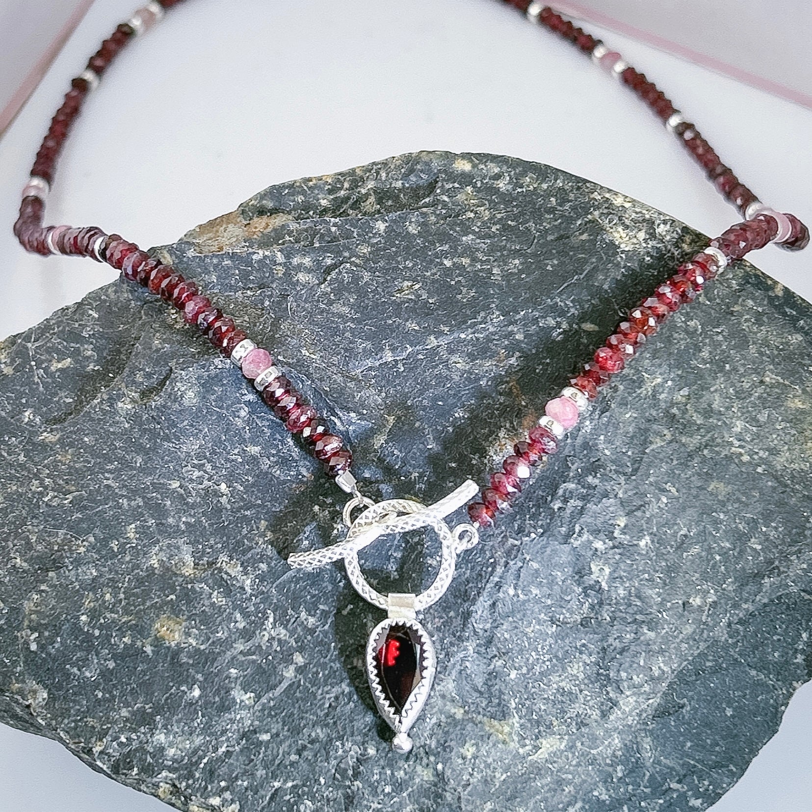 Garnet locket necklace, beaded garnet gemstone chocker necklace, fancy statement layering necklace with sterling toggle clasp.