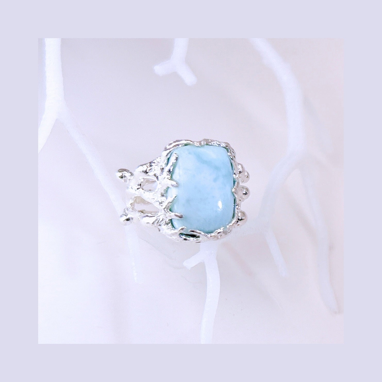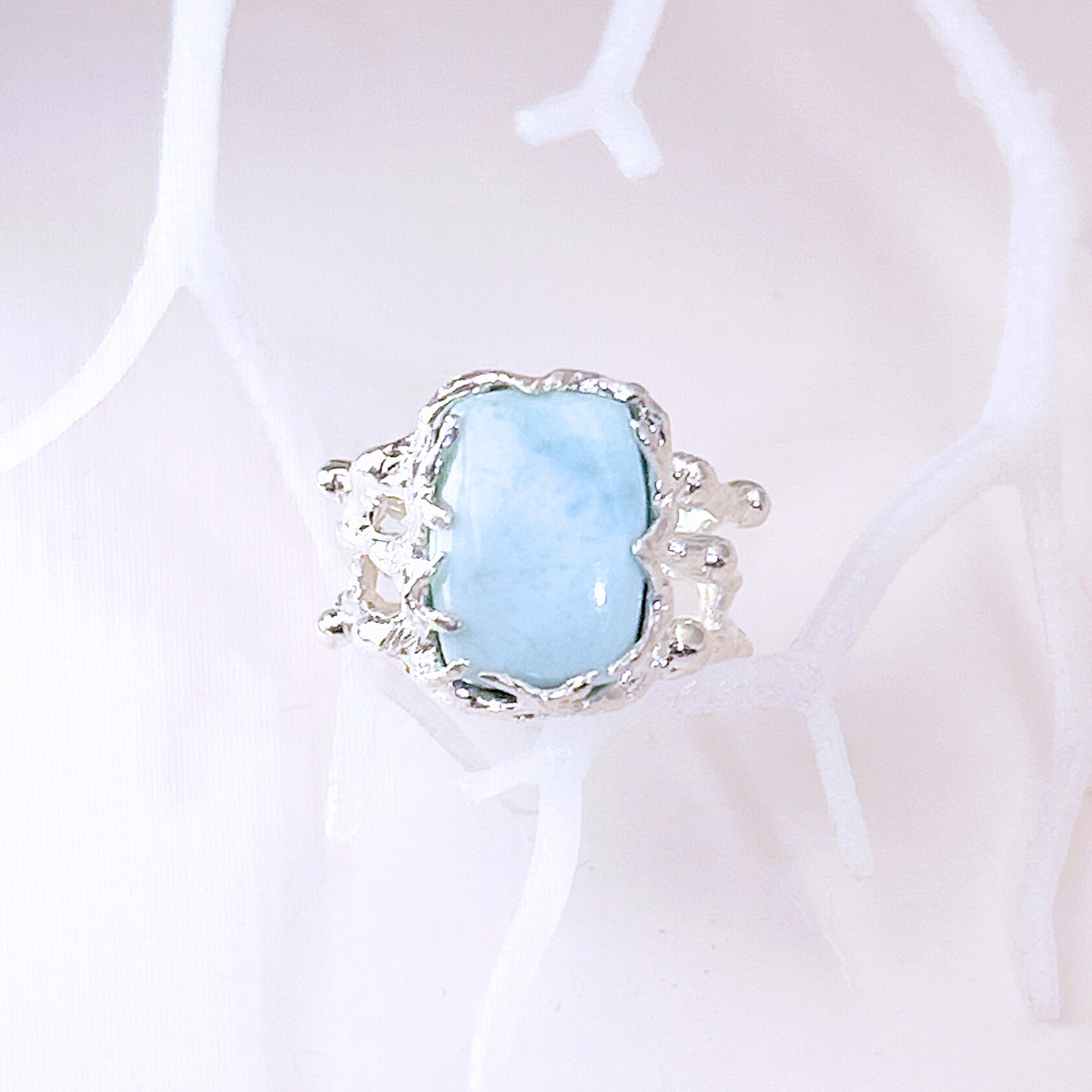 Larimar, moonstone ring, statement piece in a Hand-craved wide casting ring band, with melted details. Sterling silver ring, ocean jewelry