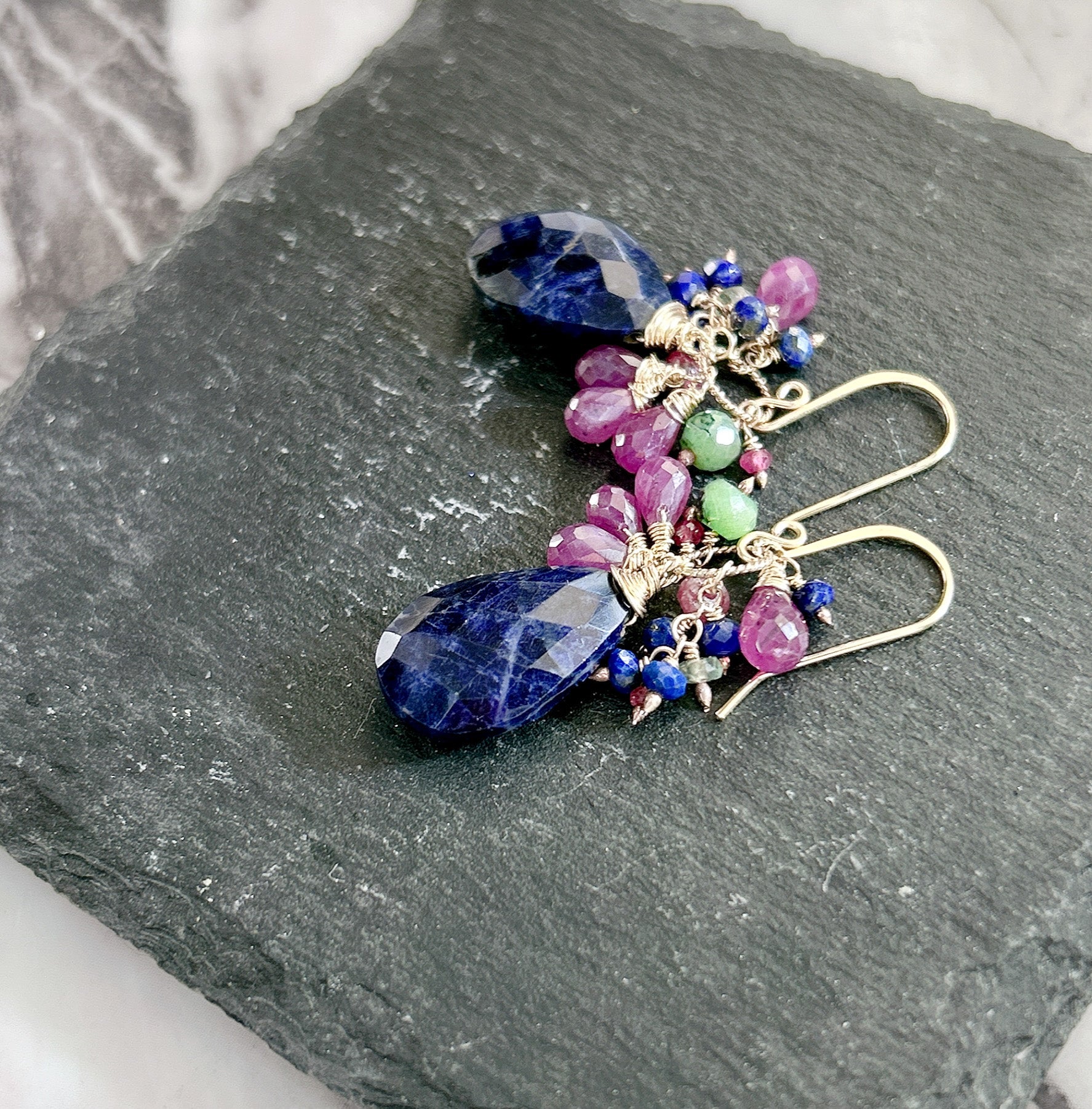 Natural sodalite dangle earrings with Ruby, lapis, emerald. one of a kind pair.
