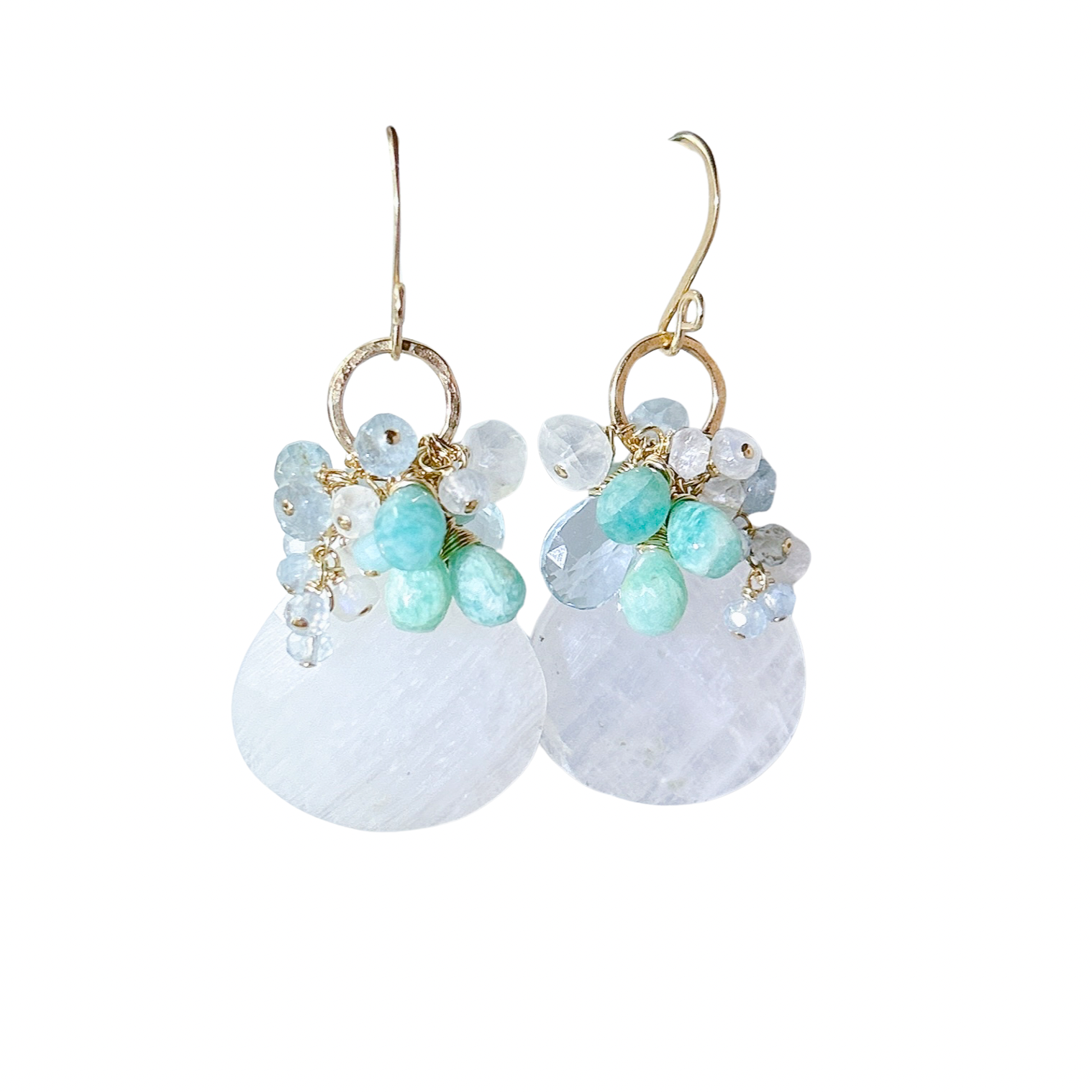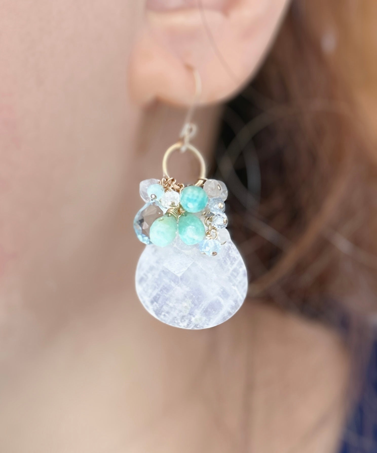 Rainbow moonstone earrings, aquamarine, amazonite, blue topaz gemstones cluster dangle earrings