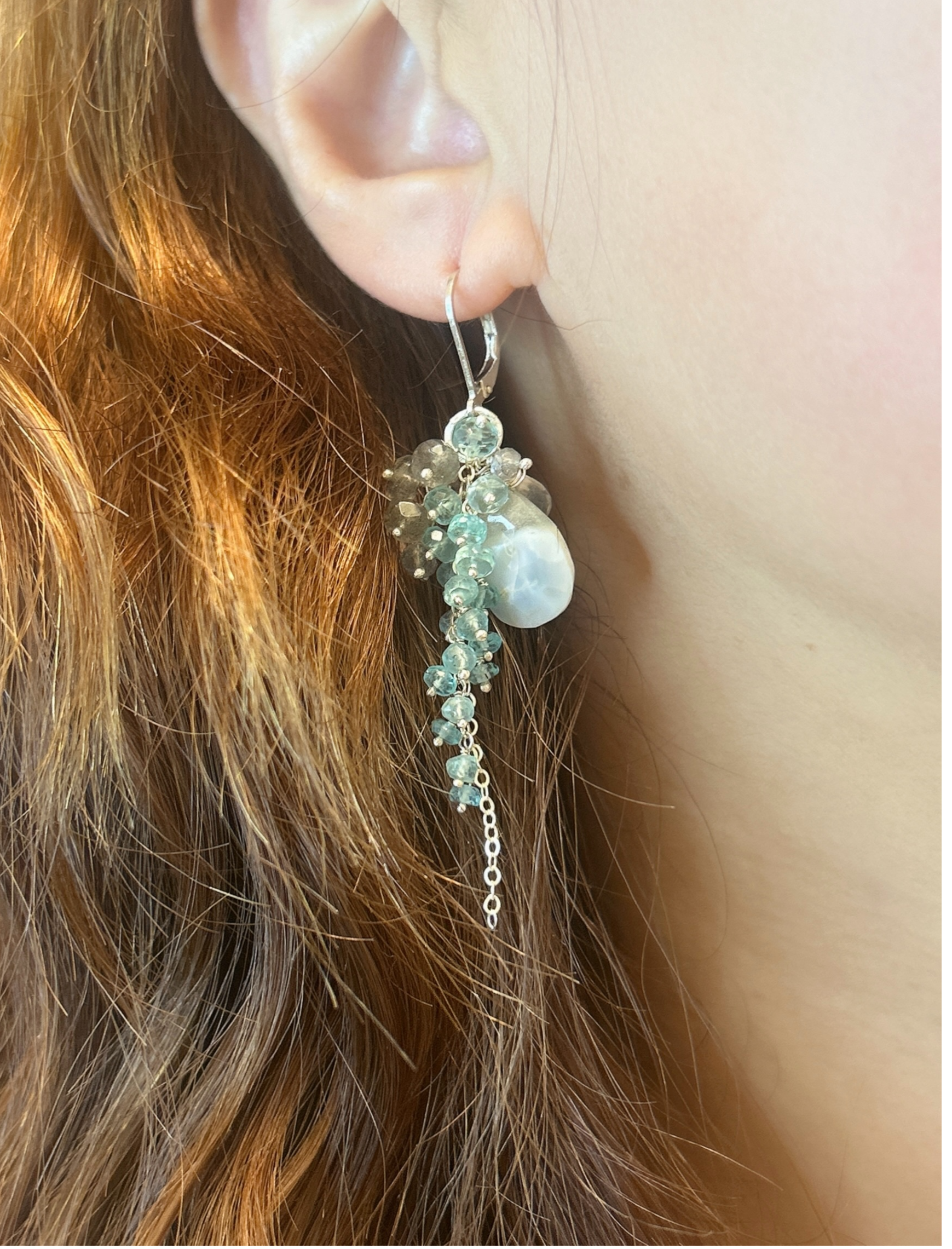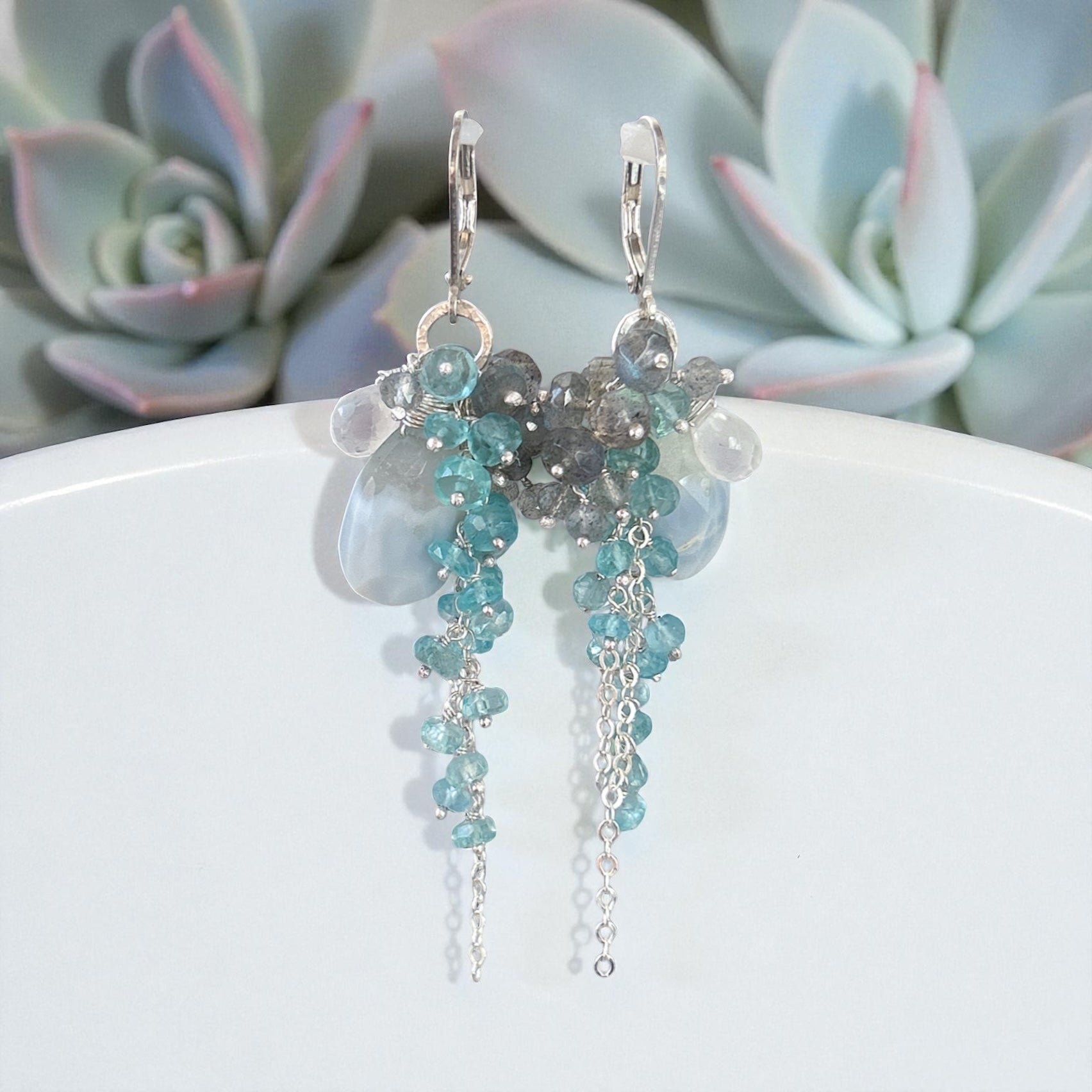 Winter wonderland earring with blue opal, teal apatite, labradorite. Snowy winter outfits for holiday season. Sterling silver cluster earrings for her.