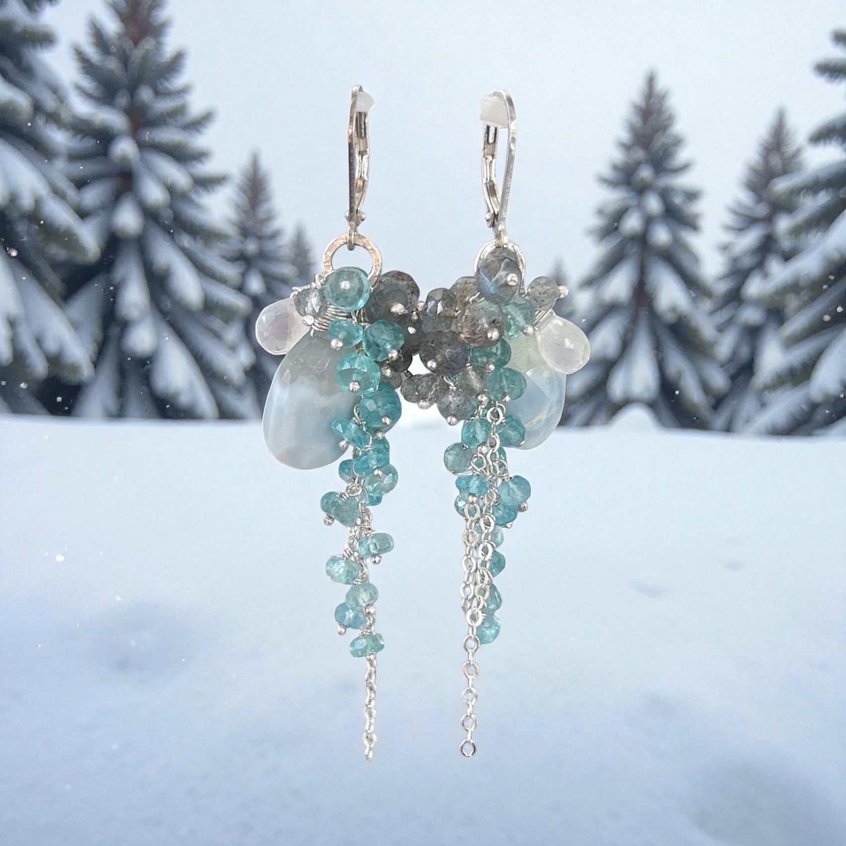 Winter wonderland earring with blue opal, teal apatite, labradorite. Snowy winter outfits for holiday season